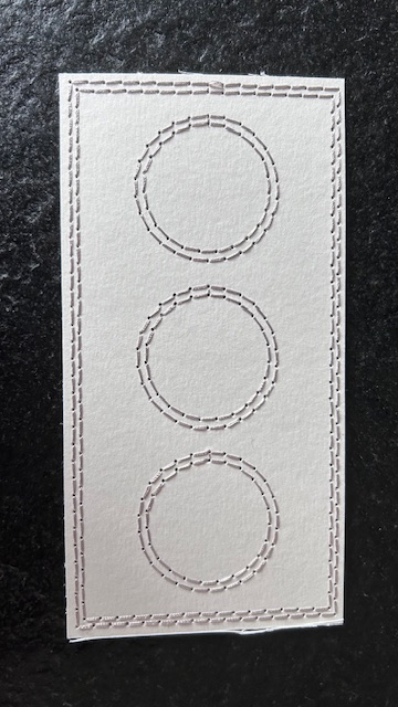 Embellissement de papier Aquarelle composé de trois cercles brodés au sein d’un rectangle (bords brodés) dont les dimensions sont de 7,5 cm x 15,8 cm. L’usage de la peinture est possible ainsi que tous encrages.
