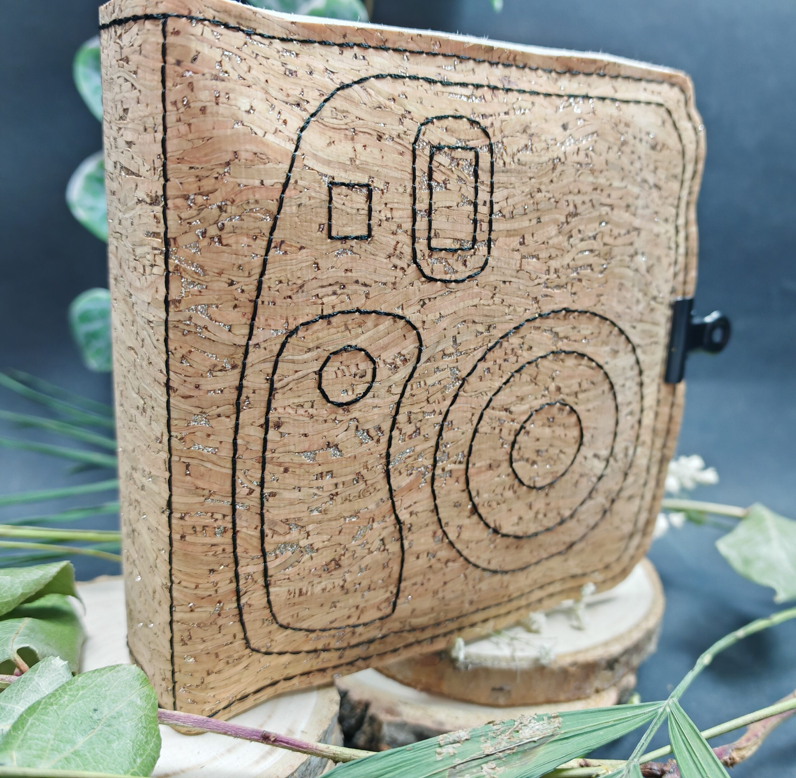 Structure d’album polaroid grand format 13×13 en liège clair avec fil noir et paillettes – attache incluse.